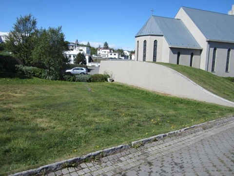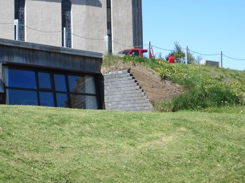 They added on church offices and Sunday school rooms, but I couldn’t find any information about who did the design or when. The entrance is from the church parking lot, then you go down into the building. You can see from the last few pictures that it is entirely covered in turf…harking back to the turf farms.