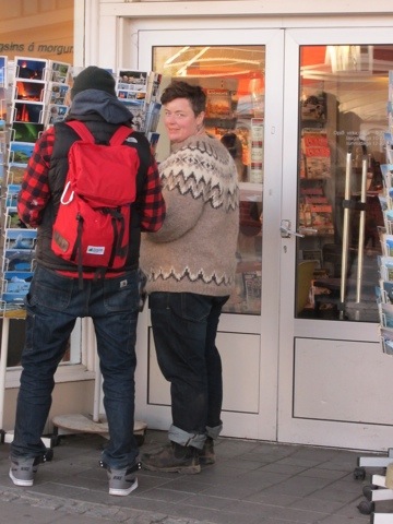 Oh. So all the stores around here sell hand-knitted Icelandic sweaters. They are VERY expensive and too warm for California …but the funny thing is everyone here wears them. Cool teen-age girls and boys, men, moms, strange trolls in front of tourist shops..(rarely children I think they are too expensive for that)