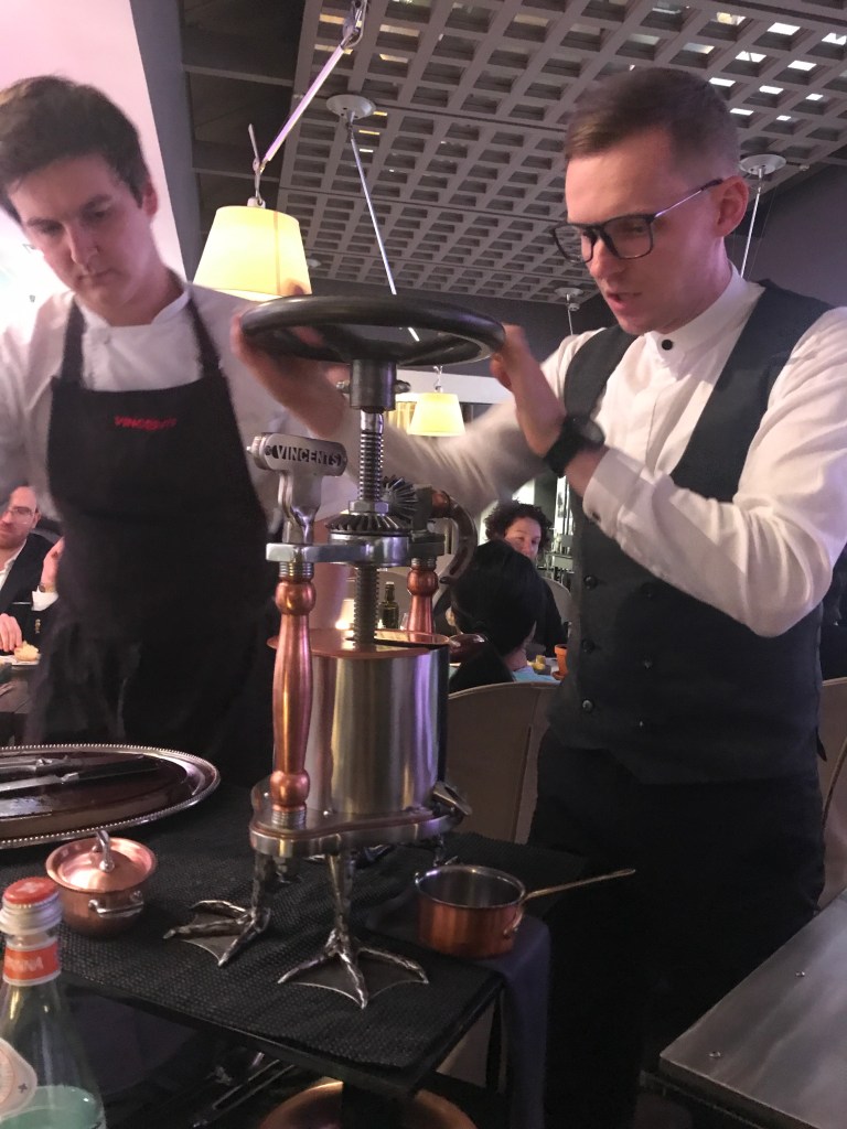 We ordered duck Cunard because they said you had to have it once. It came with its own birth certificate. They prepared it at our table. Check out the feet on the press.