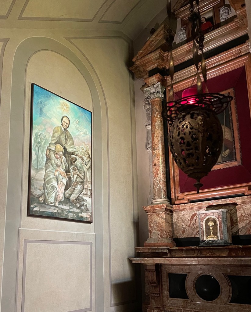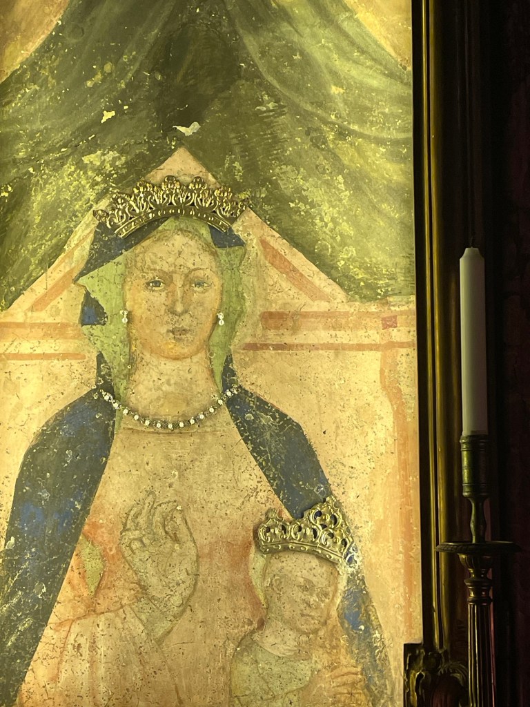 We walked around and looked at everything again. churches, buildings, alleys. Went to a very small church and saw this very old painting with newish jewelry added on. I kinda get the crown, and even the necklace, but am honestly struggling with the earrings on Virgin Mary.