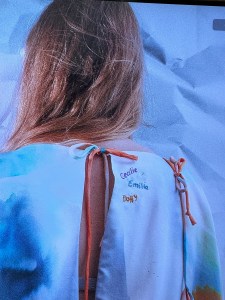 This town the women would embroider their names on clothes before they turned them in to the thrift shop. So he put that on the back of their dress