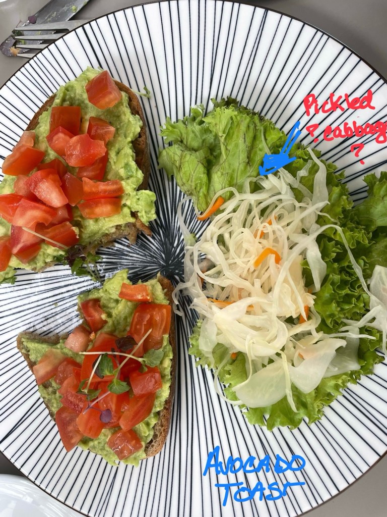 One of my favorite delights when we travel is to see the interpretation of “American” food. I love the energy of someone trying and the cross cultural expression that occurs. I ordered Avocado toast with tomatoes. It was GREAT with the pickled cabbage (?) on the side!