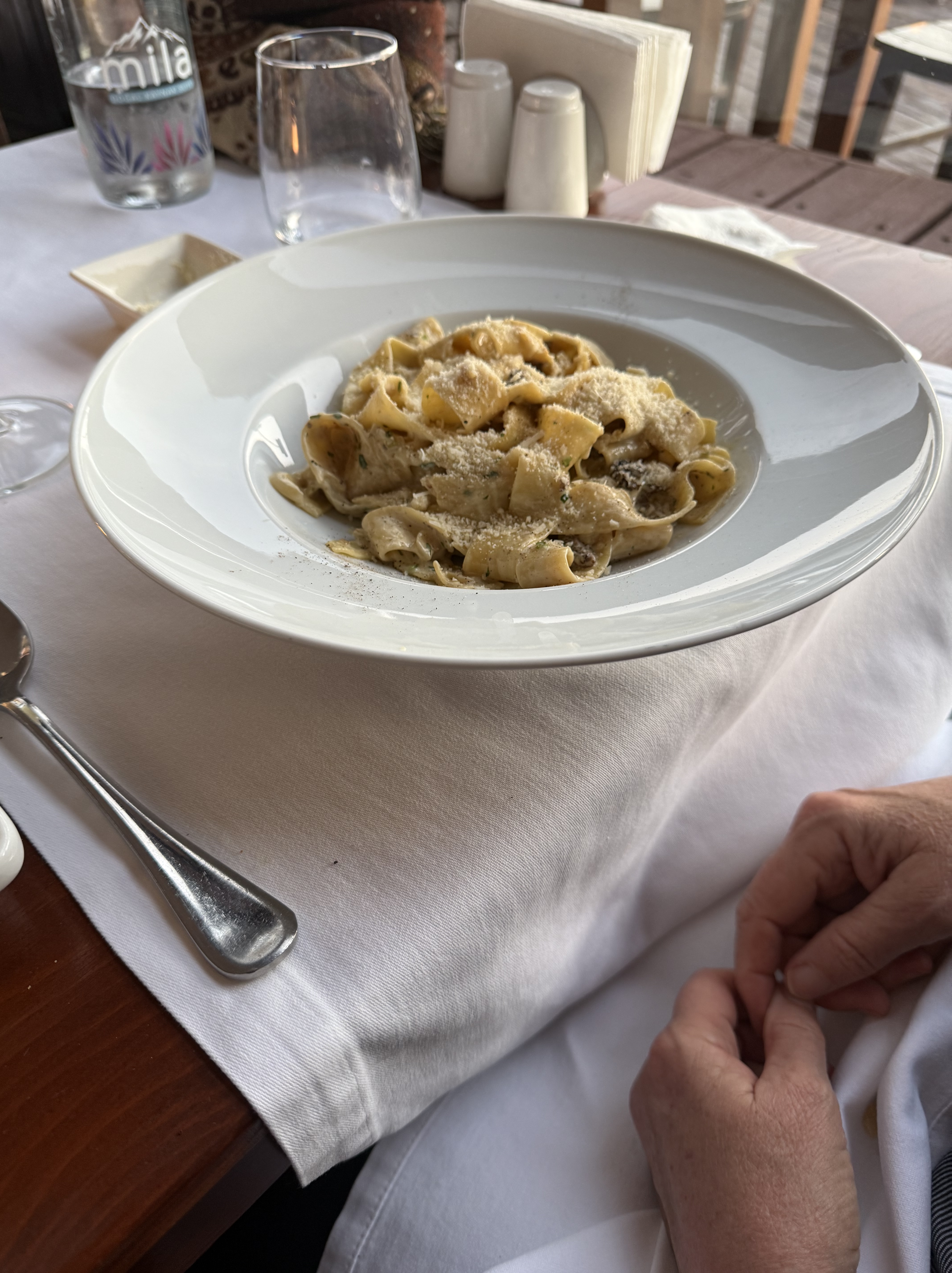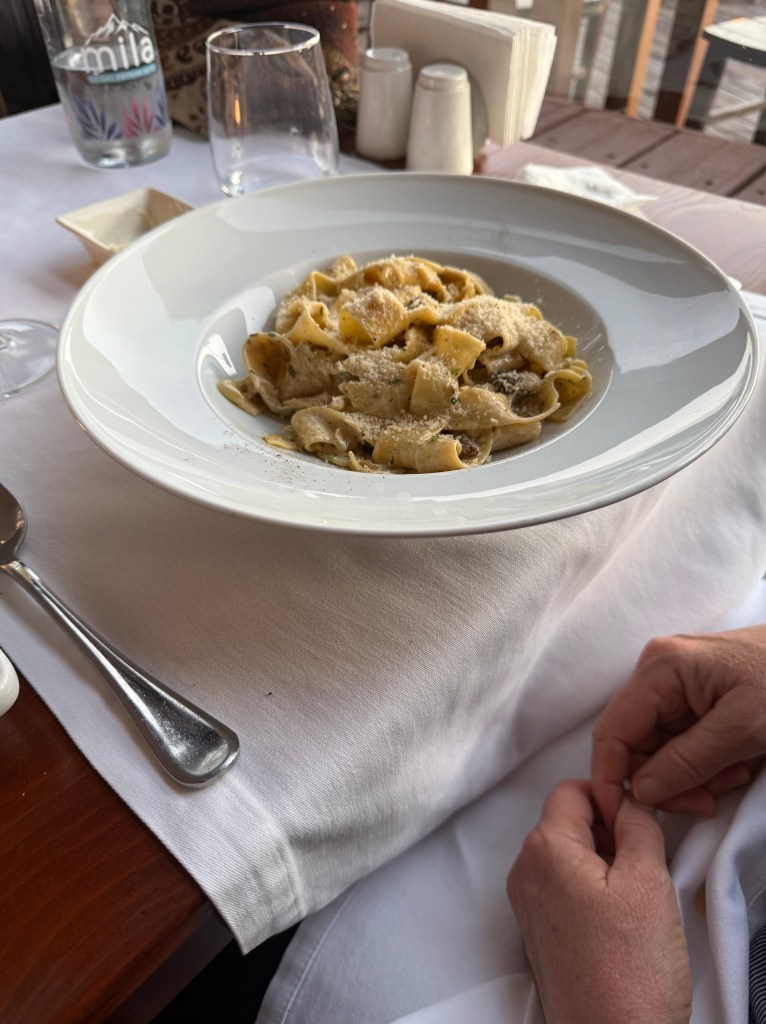 Went back in last night, again after a late lamb shish lunch. And so I told our waiter (same guy) “I think I’ll have the Burrata Salad and the starter ravioli for dinner”. He said, “And your Muishroom pasta after that?” Max and I laughed….and then realized he was serious…Cancelled the ravioli… Loved the leftover pasta! A LOT!
